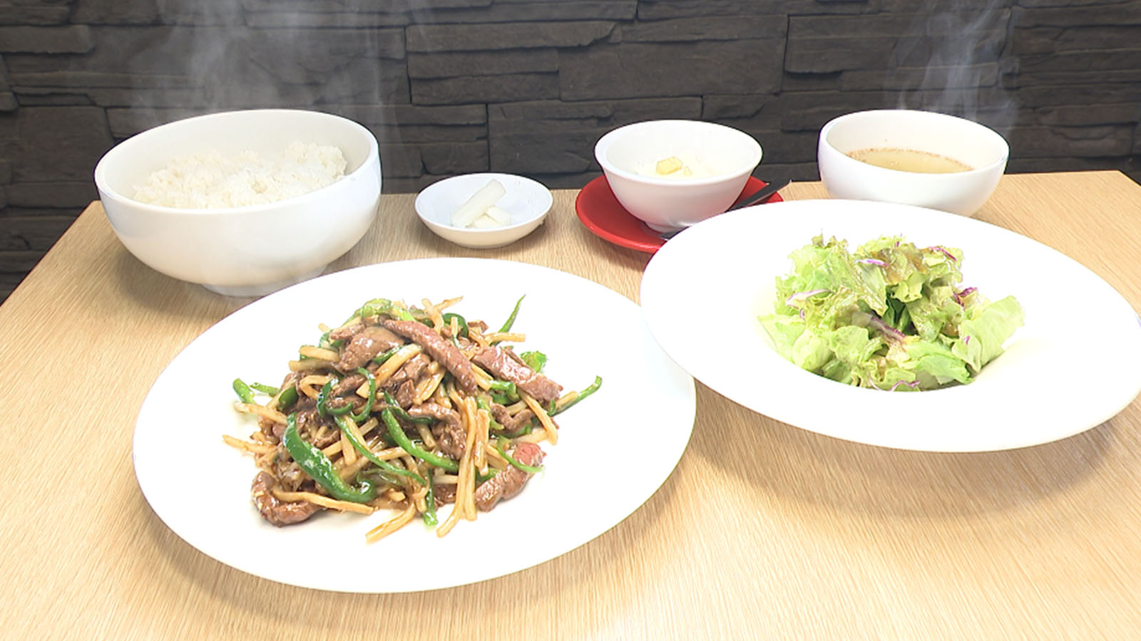 休止していた人気の定食も復活。『チンジャオロースー定食』(1,350円)は、まず山梨のブランド牛である甲州ワインビーフのスー(細切り)を油通し。中華鍋に刻みネギ、ニンニク、ショウガ、鶏ガラスープを入れ、タケノコのスー、ピーマンのスー、油通しした牛肉を炒(いた)める。そして、ヒントン(塩ダレ)、オイスターソース、中国しょうゆなどで味付け、片栗粉(かたくりこ)でとろみを付ける。