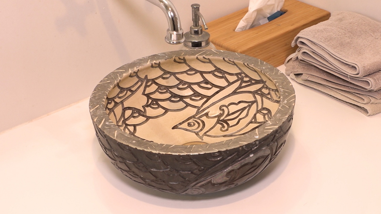 続いては、シャワールームへ。大沢は、絵が描かれた洗面ボウルに注目した。これは沖縄の伝統的な『やちむん』の器で、『やちむん』とは沖縄の言葉で「焼き物」を意味している。拓朗さんは「かっこいいから家に置きたいなと思って」と、沖縄の伝統工芸への愛をのぞかせた。