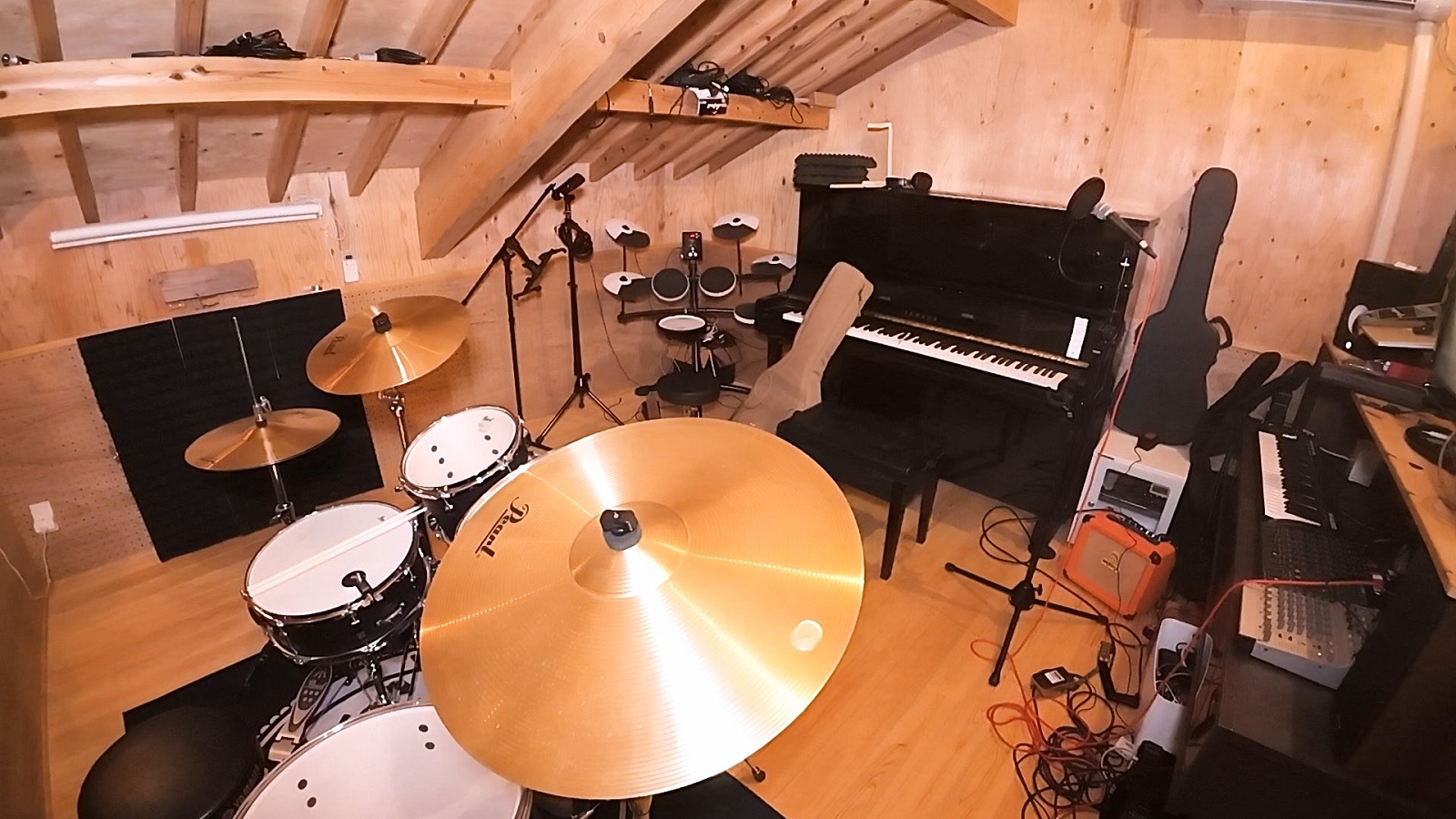 大沢は「えー!なにこの部屋!」と言って部屋の中をのぞき込む。部屋の中には、電子ピアノやドラムセット、ギターが置かれていた。そう、ここは音楽室。大沢が「なんでこんなお部屋を作ろうと思ったんですか?」と尋ねると、拓朗さんは「私が音楽をしたくて、防音でつくりました」と話し、趣味でギターを弾いていることを明かした。