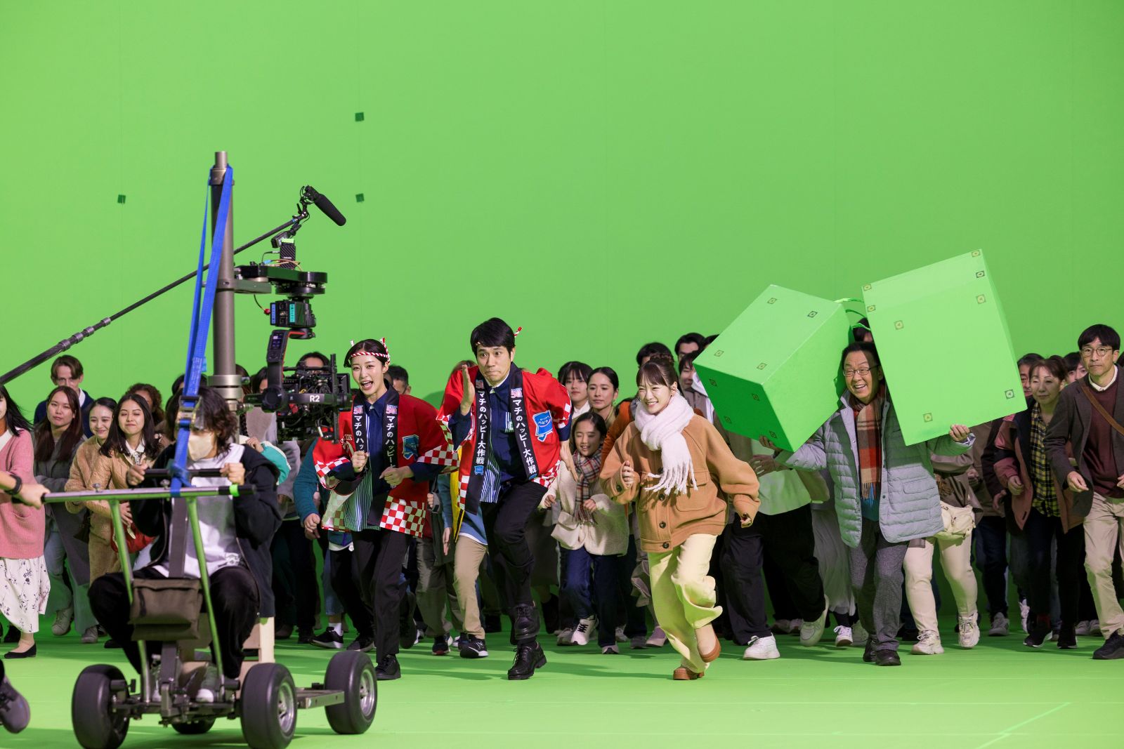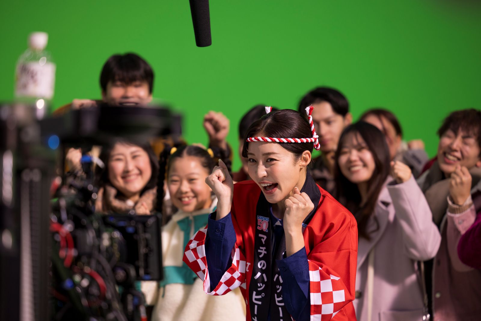 そして、空から降ってきた商品に川栄と梅沢が飛びつき、「ゲーーット!」と客と共にゲット。最後は、盛りすぎチャレンジの巨大な旗がはためく中、4名と客が⼀緒に走り、松山店⻑と王林クルーの「今年も盛りすぎチャレンジで~」に続き、4名で「ハーピろ!」と盛り上がるストーリーだ。