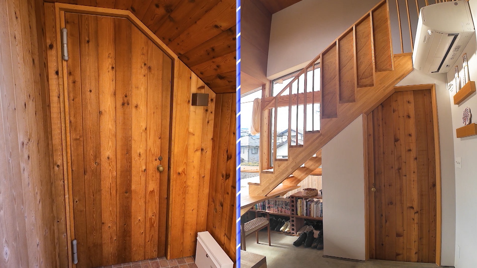 アイデアの1つ目は、斜面にある旗竿地というマイナスをプラスに変えた、玄関へのアプローチだ。玄関まで約2mの高低差があるため、石と枕木で階段を作り、山の小道のような演出をしている。また、玄関の扉も珍しい形になっていて、「中に入るとわかるので」という洋介さんに促されて、2人は中へ。中に入って上を見上げると、中谷は「なるほど、そういうことね!」と納得した。扉の上には2階に続く階段があり、扉はスペースを有効活用するため、階段の形に合わせて凹んでいるのだった。