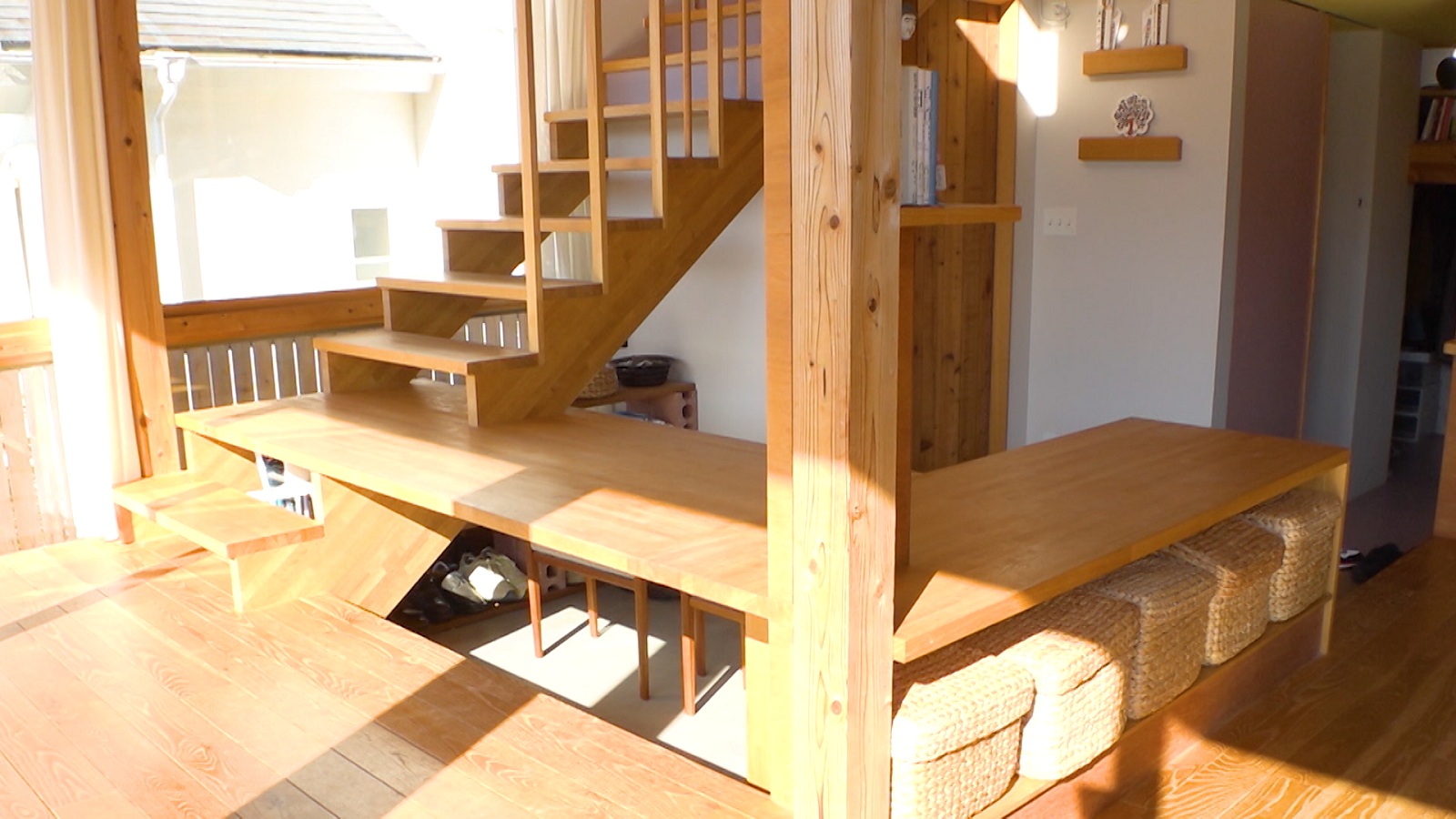 他にも、階段の2段目は広く作られており、テーブルとしても利用できる。さらに、洋介さんが「堅苦しい使い方は考えていなくて、その都度その都度で」と話す通り、階段兼テーブルに腰をかけて使うことも可能だ。階段・テーブル・イスの3WAYの構造のおかげで、友人を呼んでホームパーティーが開催できるほど広々とした空間を実現している。