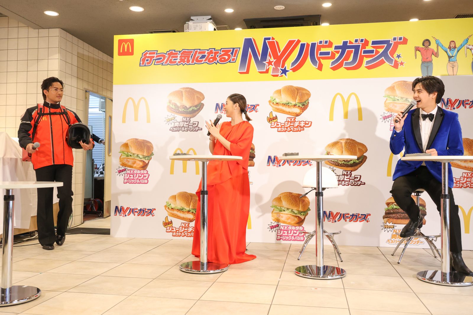 日本マクドナルドの新商品「行った気になる!N.Y.バーガーズ」の発表イベントが開催され、GENERATIONSの数原龍友と片寄涼太、タレントのみちょぱこと池田美優が登場。新商品の魅力を語るとともに、ニューヨークにまつわるトークに花を咲かせた。