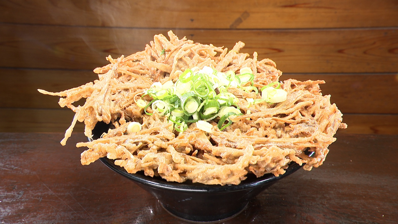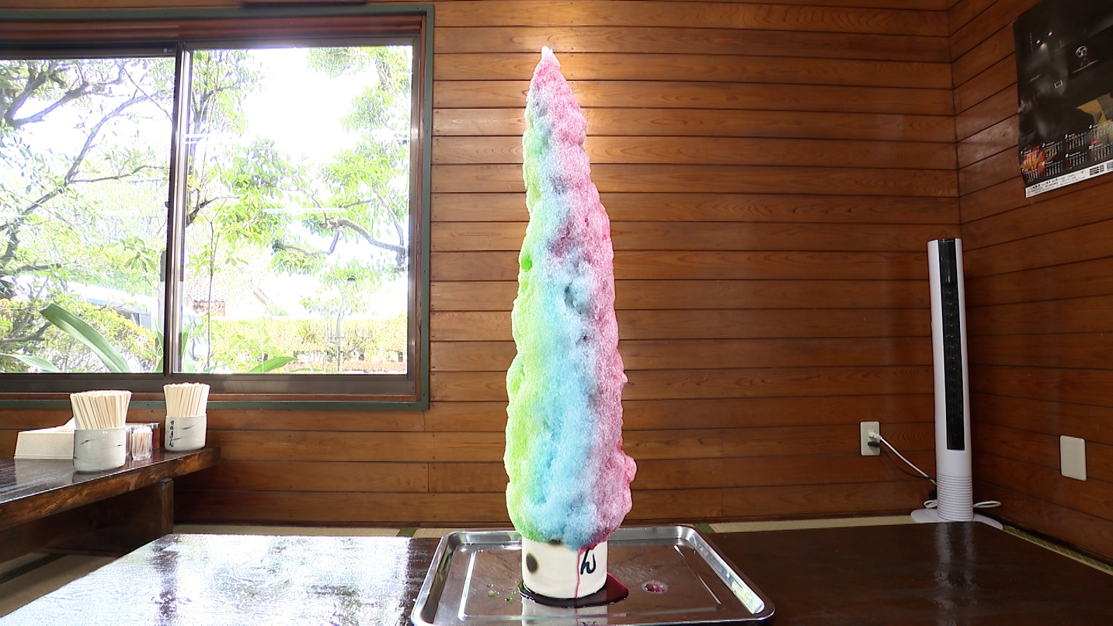 宮崎県産のシイタケを1週間かけて味付けした『椎茸うどん』(620円)や、直径約25cmのゴボウのかき揚げが乗る『ごぼう天うどん』(650円)、高さ約80cmの『レインボータワーかき氷』(990円 ※4月下旬~10月下旬まで提供)などが名物のお店。店主の岩切宗百(いわきり・むねかず)さん(37)によると、去年の夏は大変な盛況だったそうで、臨時駐車場を100台借りたとのこと。それでも連日満車だったという。