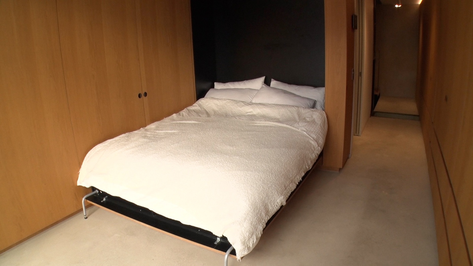 2階に上がると、約6帖(じょう)の洋室があったが、部屋は殺風景で何も置かれていない。しかし、ジェシーさんが壁に手をかけると、なんと壁の中からベッドが現れた。この部屋は、夜はベッドルーム、昼は子どもの遊び場として使っているのだそうだ。
