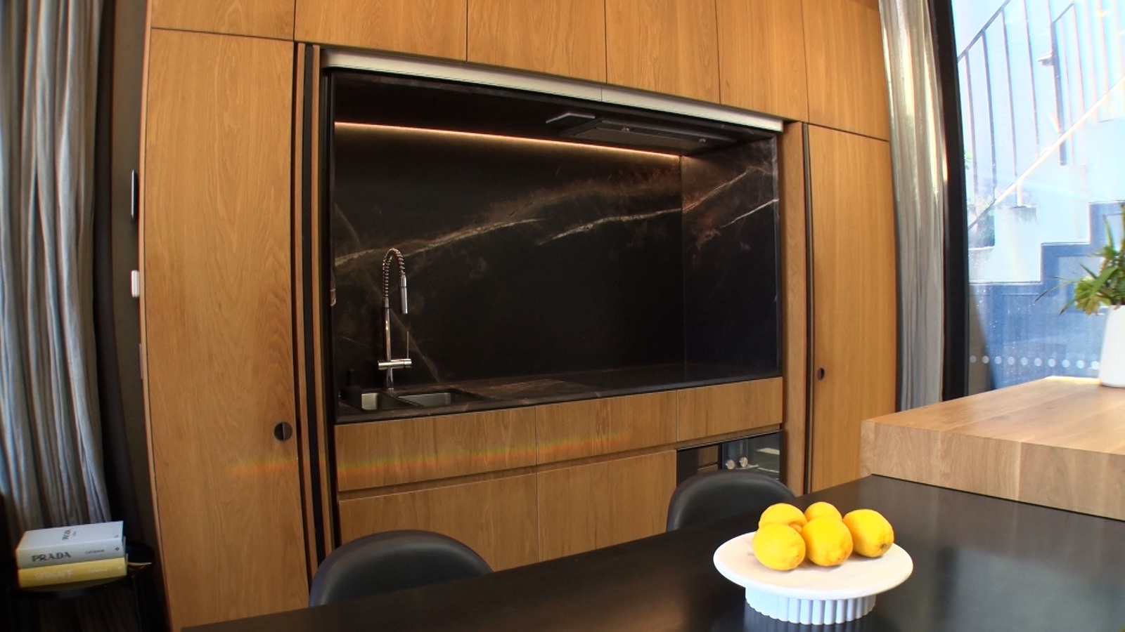 カーテンの役割を果たす黒い壁には穴が空いていて風が入るため、完全に閉め切っても暑くならないという工夫もある。ここで、ベッキーはキッチンがないことに気付く。シアダさんに「探してみて」と言われ、ベッキーがダイニングテーブル奥にある収納を開くと、なんとシンクとIHコンロが現れた。部屋を広く見せる工夫の数々に、スタジオからは「すごい」と声が上がった。