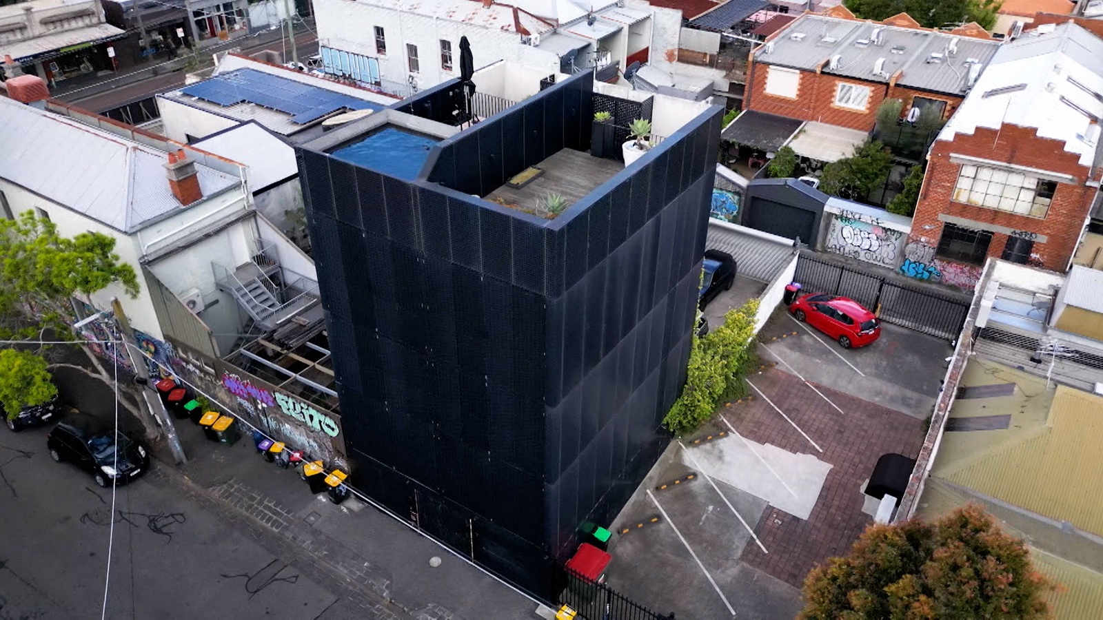 目的の家に着いたベッキーは、「なんじゃこりゃ!家ですか?急に住宅街に黒い箱が」とそのミステリアスな見た目に驚いた。この家は360度真っ黒な壁に覆われており、窓がどこにもないのだ。