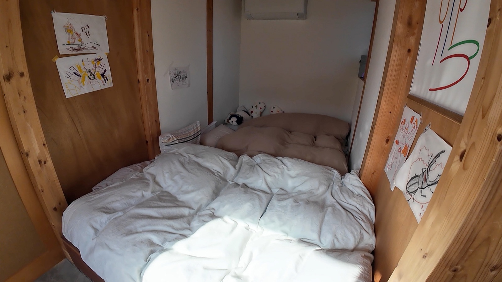 続いて、2人は約3帖の寝室へ。小上がりの寝室の下は子どもの本を収納する引き出しになっている。夢空間と寝室が隣り合っていることについて、小山が「大丈夫なんですか?」と言うと、沙織さんは「ここは9時から16時までしか使わない」と、夢空間を使う時間が決まっていることを明かした。さらにヒントを求めて、小山が「僕とか奥田さんも使ってます?」と聞くと、沙織さんは「奥田さんたちも1か月に1回とか使うかもしれない」とヒントを出した。