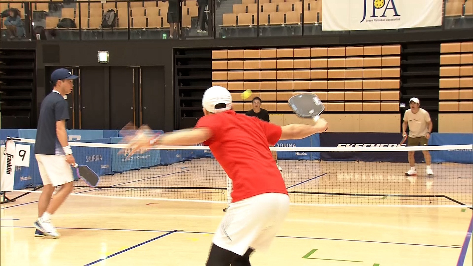 エキシビションが始まると、石黒は序盤から積極的に前へ。相手方との距離を詰めつつ、チャンスをうかがいながらボールを打ち返していく。ミスした時も、狙いがうまく行った時も、ペアの佐藤氏とラケットを重ねて互いを励ましあっていたのが印象的だった。プラスティック製の穴あきボールをラケットが叩(たた)く際の卓球に似た軽快な音は、打ち合いが続くと小気味のいいリズムで会場に鳴り響く。その心地良さは、ピックルボールならではだろう。