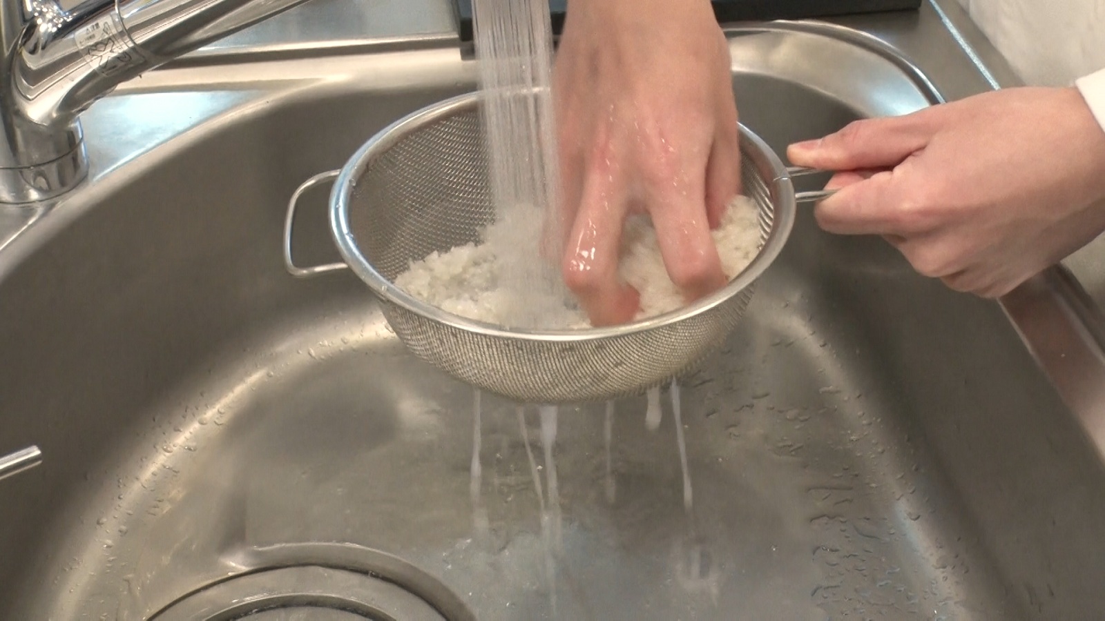 「“研ぐ”ではなく、“洗う”です」と説明するおいりさん。研ぎ汁が透明になるまでお米を研ぐと、お米の表面が傷つきデンプンが流れ出てしまうため、炊いた時に粘りが出てしまうという。お米の表面のゴミを取り除くように軽く洗うこと30 秒。サッと洗うだけにすることでお米のうまみや栄養素をより多く残すことができるそう。