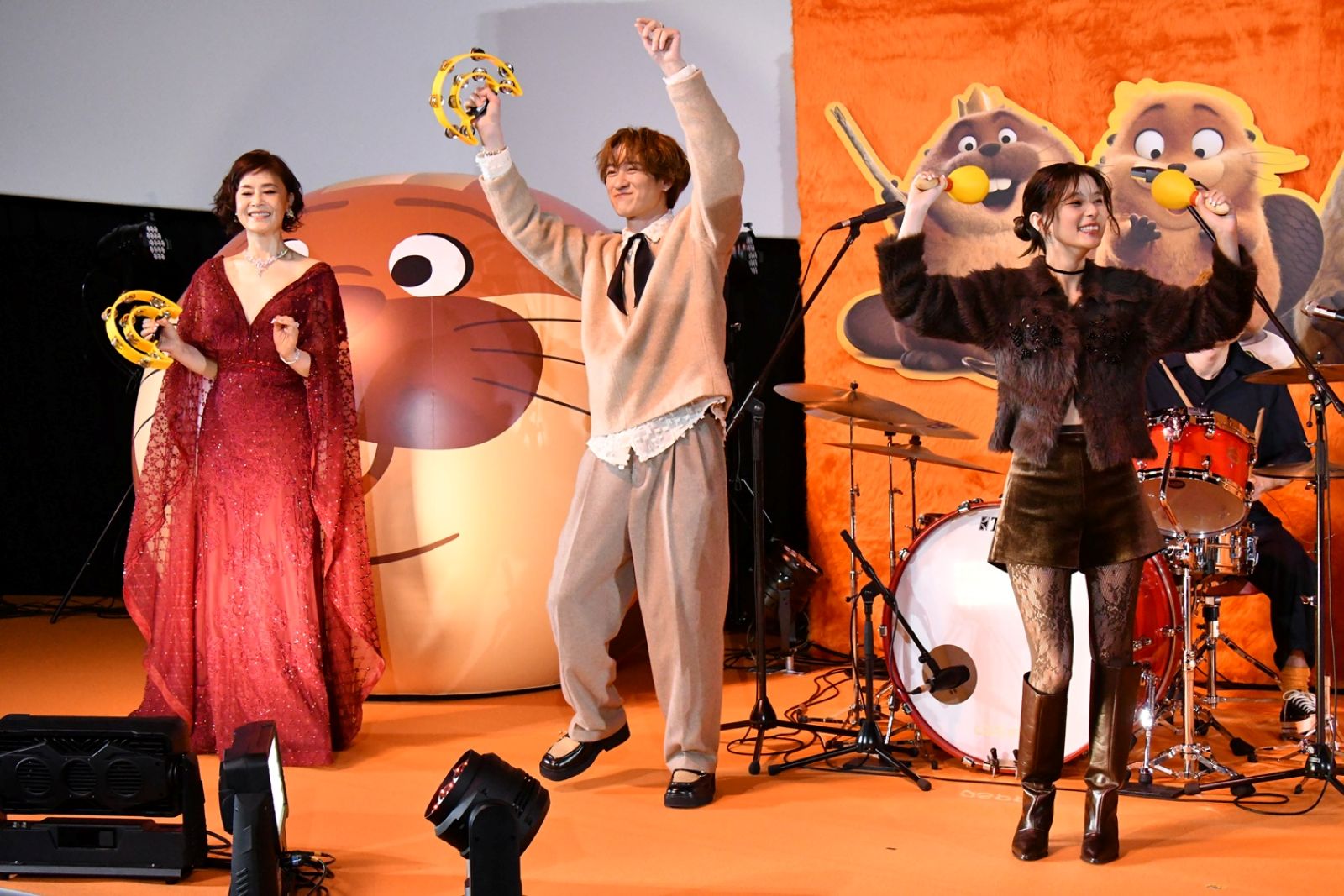 会場にはビーバーをイメージした“もふもふビーバーフード”に身を包んだ観客が溢れる中、イベントのオープニングを飾ったのは、PUFFY の二人による日本版エンドソング「愛のしるし」の生歌唱。もふもふのビーバー姿で登場したPUFFYのライブパフォーマンスに会場は大盛り上がり。さらに曲の終盤には PUFFY の掛け声で日本版声優を務める芳根京子、小手伸也、宮田俊哉、渡部篤郎、かなで、大地真央がタンバリンやマラカスを持って登場し、観客とともに PUFFY を応援!“もふもふ”ビーバーパーティーにふさわしい盛り上がりの中、幕を開けた。