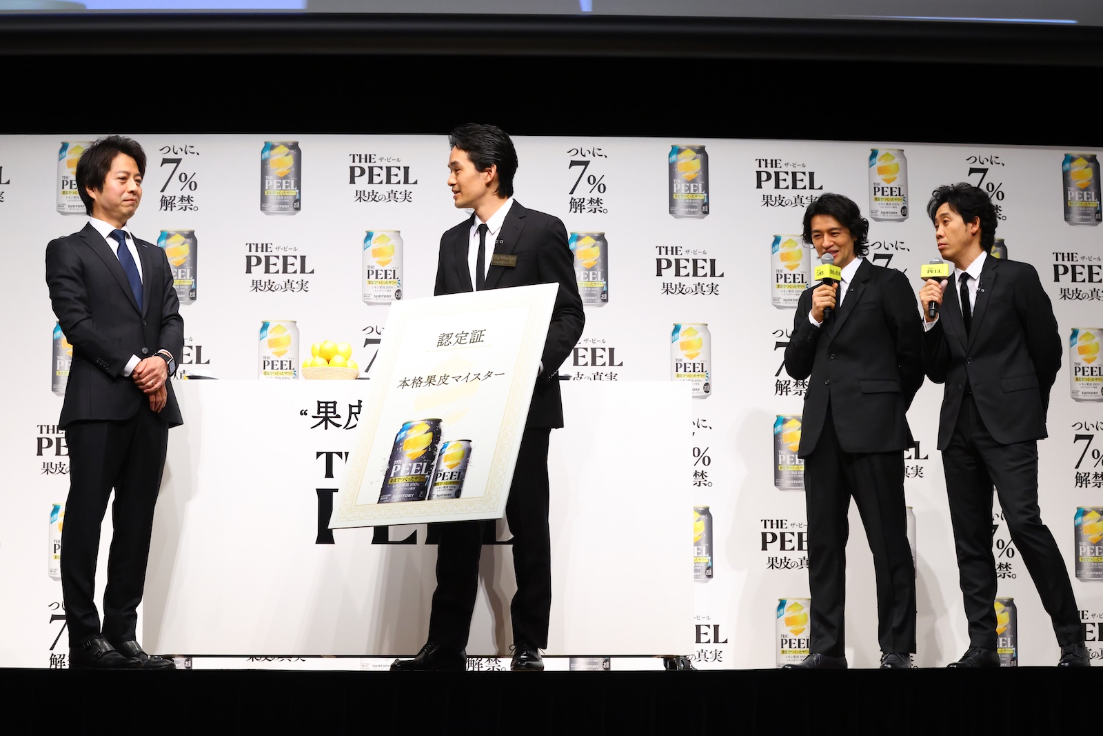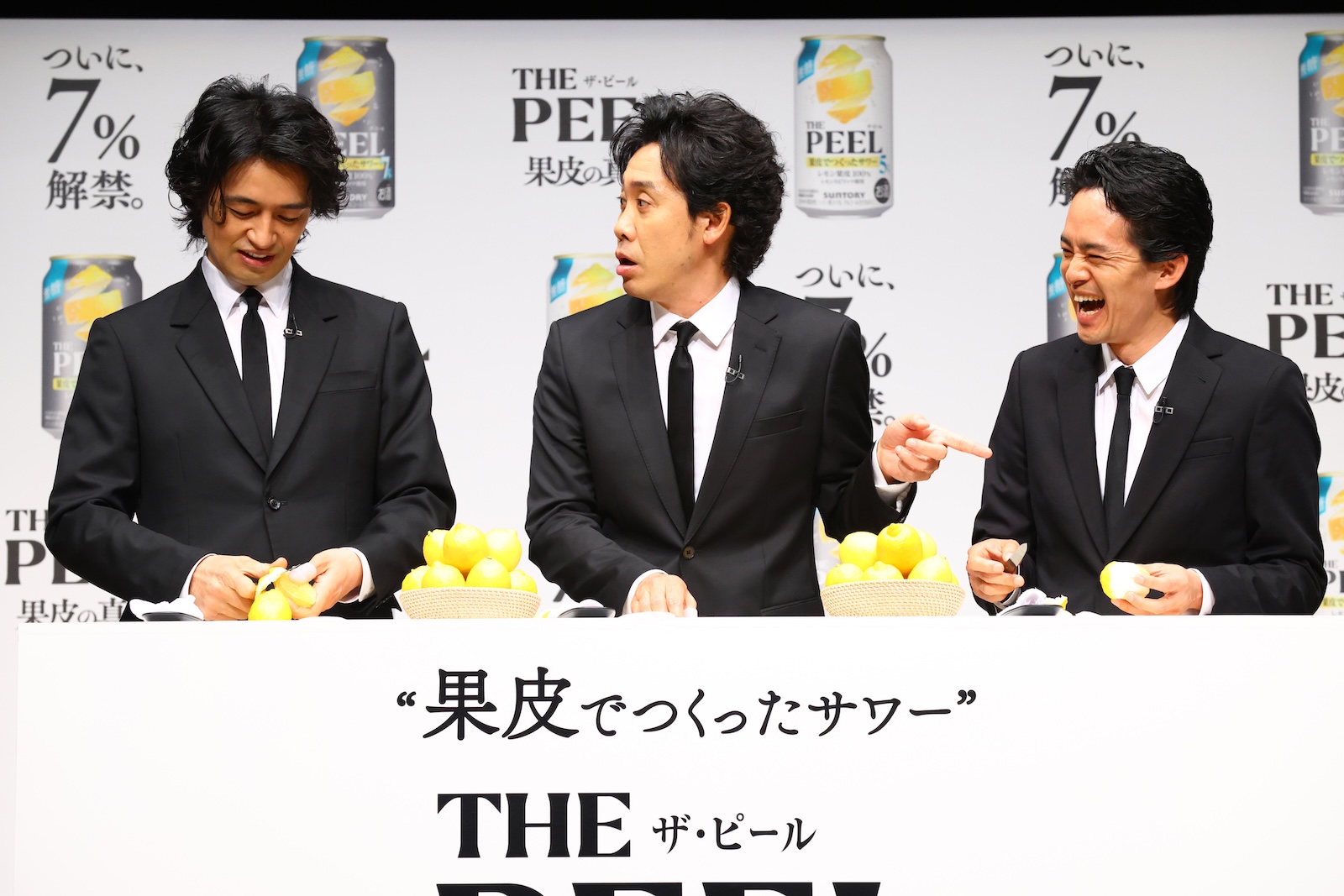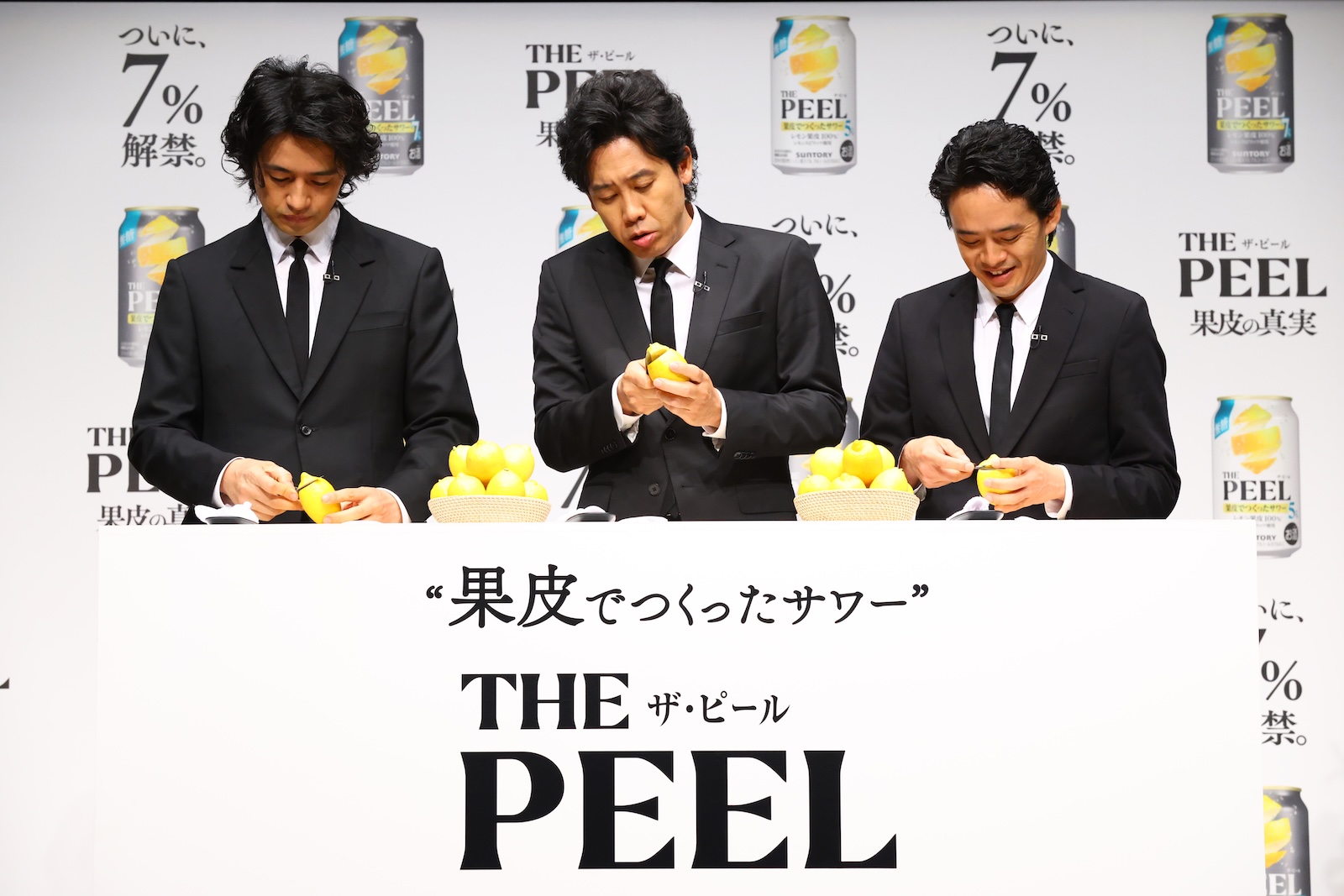“果皮でつくったサワー”「THE PEEL」商品説明会&新TV-CM発表会にブランドメッセンジャーの大泉洋・斎藤工・池松壮亮が登壇。レモンの果皮剥き対決に挑戦した。