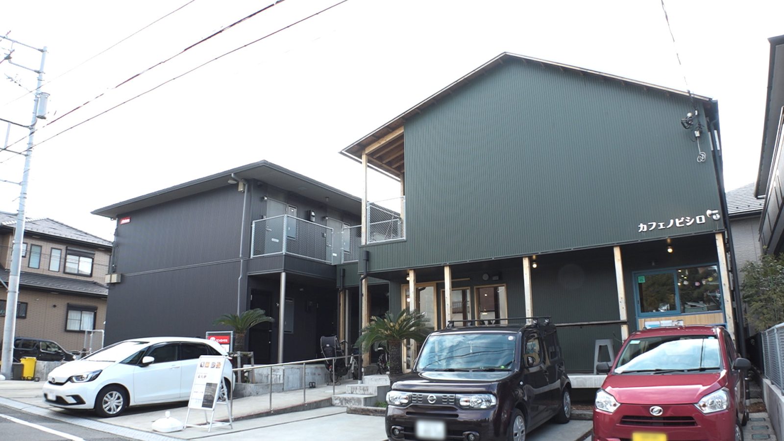 2階建て全8室のこのアパート。宮川さんの部屋は約10帖(じょう)のワンルームで、バス・トイレ別だ。アパートの1階部分には、おしゃれなカフェも入っており、カフェもアパートの管理会社が経営しているという。宮川さんは「実はこのカフェも家賃が半額になるヒント」と、2人にヒントを出した。