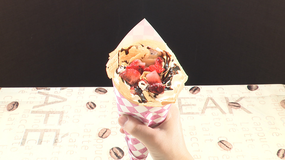 1番人気のクレープが『いちごチョコソース』(840円)。こだわりを聞くと、「やっぱり生地じゃないですか」と男性。オリジナル配合のクレープミックス粉に、柑橘(かんきつ)系のエッセンスと、バニラエッセンスを少量加え、サラダ油で伸ばしながら、鹿児島県産の卵を混ぜ入れる。最後は生地を網でこして滑らかに。生地を均一にするため一晩寝かせている。