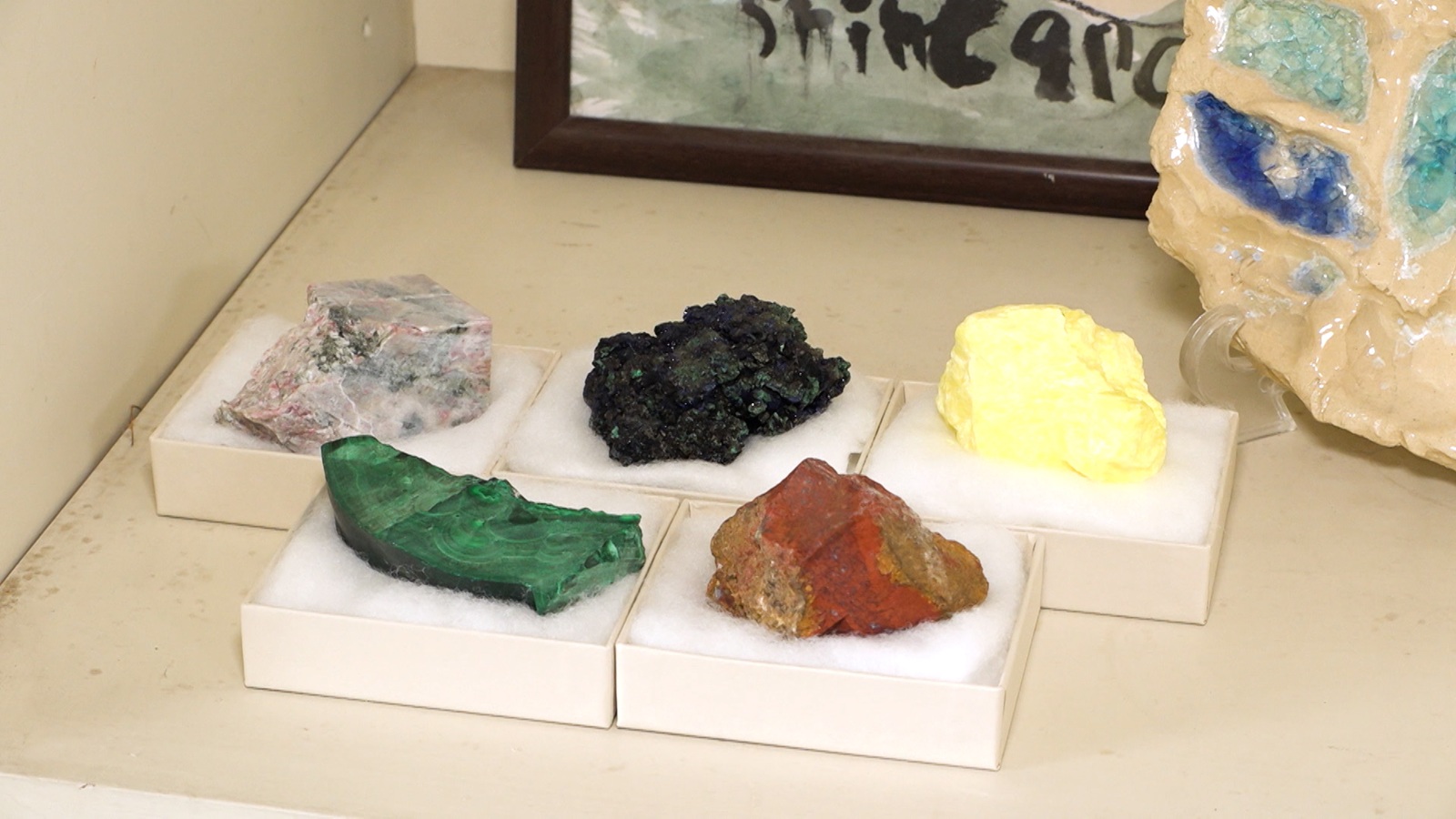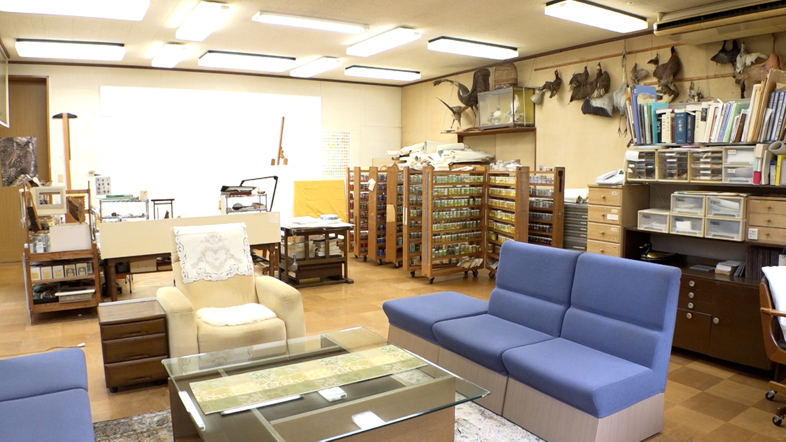 この部屋は父がアトリエとして使っていた部屋で、剥製などが置かれている。「足りない情報は、自分で鶏小屋に行って描いて。その繰り返しをずっとしてまして」と上村さん。また、リビングに置かれていた石は日本画で使われる岩絵具のもとになる天然石だった。そして、飼育員の上野さんは鳥をモチーフにした着物やタペストリーを作る染色家で、上村さんは若い芸術家をサポートするため、飼育員の仕事を提供しているのだ。
