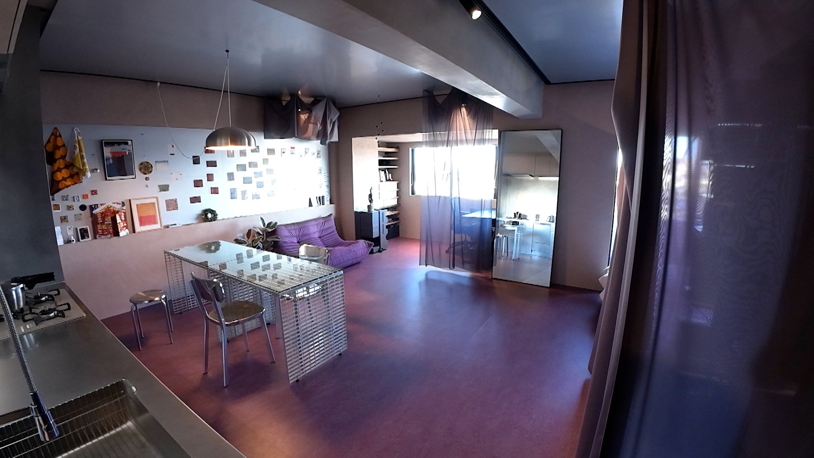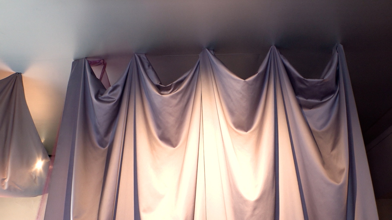 早速中に入ると、部屋は紫を基調とした空間となっており、川村は「カーテンがいっぱいありますね!」と声を上げた。カーテンは部屋の中を区切っており、壁の役割を果たしているのだという。