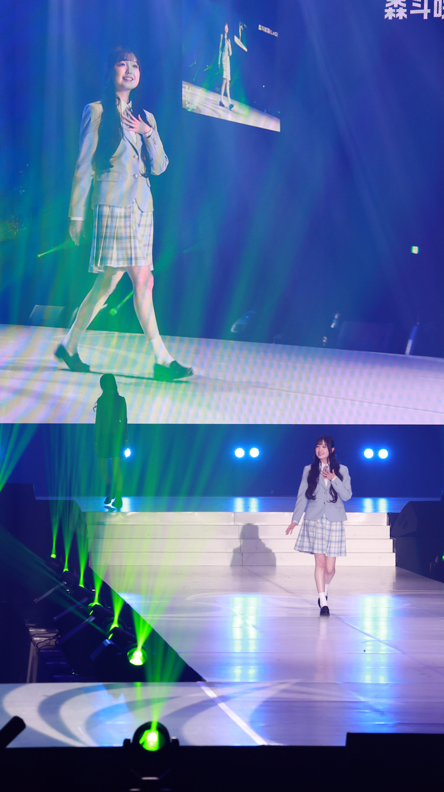 堂々としたウォーキングで視線を集めると、ポージングではLinQを象徴する“Lポーズ”を披露。これはメンバーと交わしていた約束でもあり、グループへの想いをさりげなく表現した瞬間。ランウェイという新たな舞台でも“LinQの森斗咲羽”であることを忘れない姿勢が、会場に強い印象を残した。