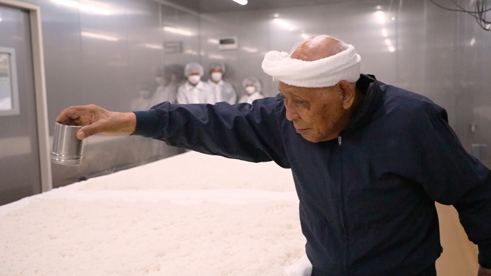 そしてそれを可能にしてしまうのが、神・農口さんだ。目を凝らすと、空気中にうっすら漂う胞子の粒煙。農口さんは、手首の返し、腕の高さ、歩くスピードを微妙に調整しながら、まるで舞うように麹菌を振りかけていく。その動きは、技術というより“芸術”。70年以上も米と向き合ってきた人間にしかたどり着けない、神の真骨頂だった。