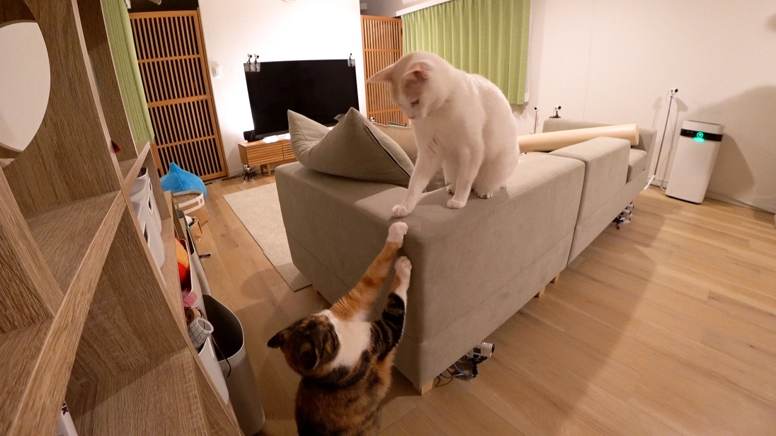 その後も先住猫たちと遊びたい一心で、何度もケージの外を動き回ったらぶ。2匹を探して段差のあるソファに上る姿を見せた。最後まで先住猫たちがらぶと遊ぶことはなかったものの、高さのあるソファの角で立ち往生するらぶに雷が手を伸ばすなど、目の見えない新入りを“気遣う”かのような動きを見せる場面もあった。