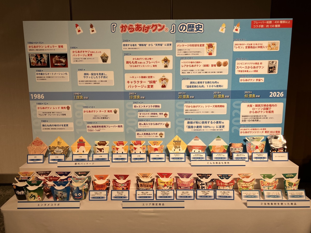 1986年4月15日に発売を開始した『からあげクン®』は、これまでに約430種類・累計48億食以上を販売。2024年1〜12月までの累計販売数は2億8,689万8,542個となり、今年3月5日(木)に『最も販売されている揚げたてからあげブランド』としてギネス世界記録™に認定。4月6日(月)に行われたメディア向け発表会では、『からあげクン®』40年の歩みや、新たに発売される新フレーバーなどが明かされた。