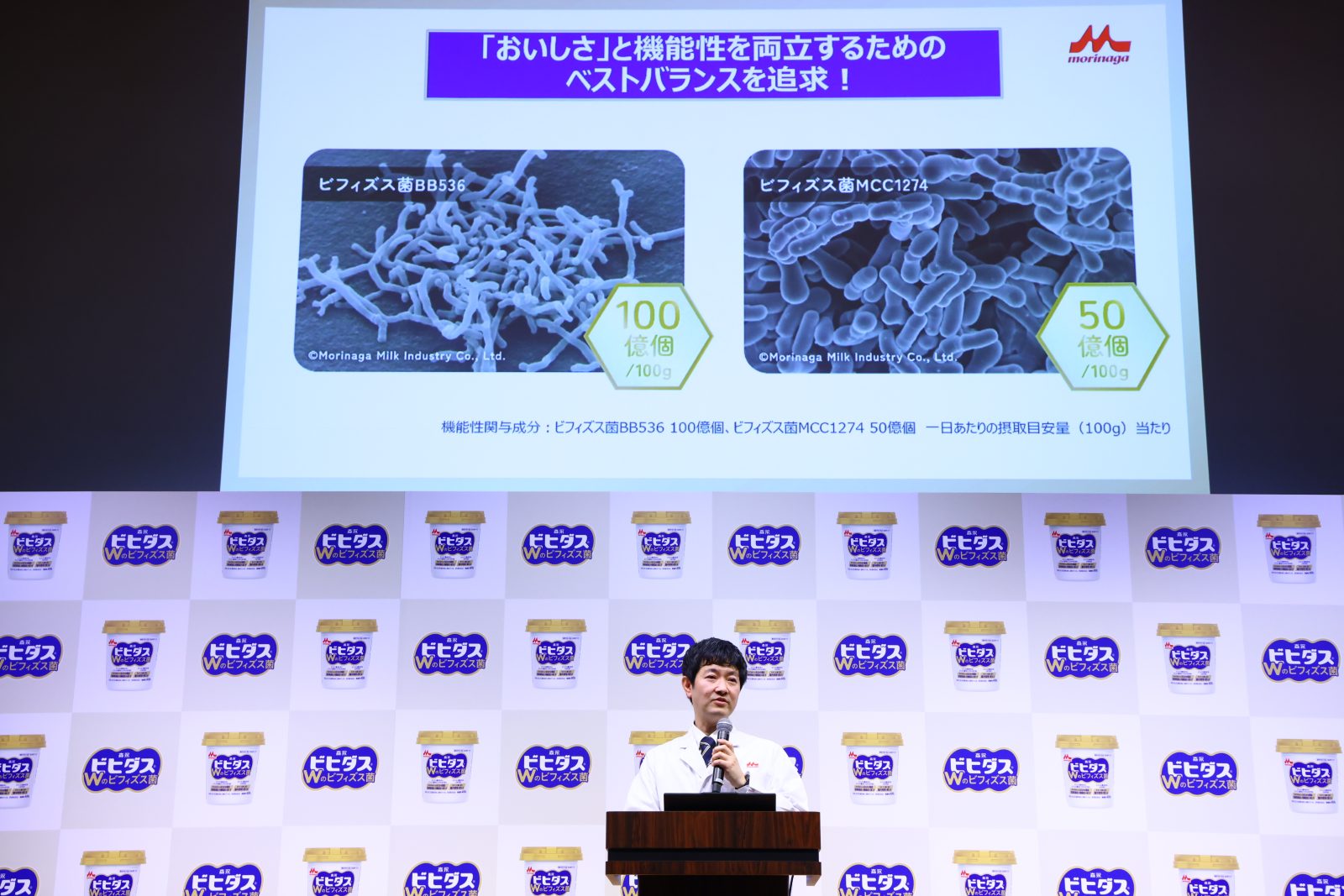 その上で、「開発に難航しましたが、美味しさと機能性を両立するベストバランスを追求し、機能性関与成分としてビフィズス菌BB536を100億個、ビフィズス菌MCC1274を50億個配合した『ビヒダスW』の開発に至りました。ビヒダスの特長である酸味を抑えたまろやかな味わいを実現することができましたので、様々な食シーンに組み合わせることができるのではないかなと考えております」と、新商品に入っているビフィズス菌の特長について説明した。
