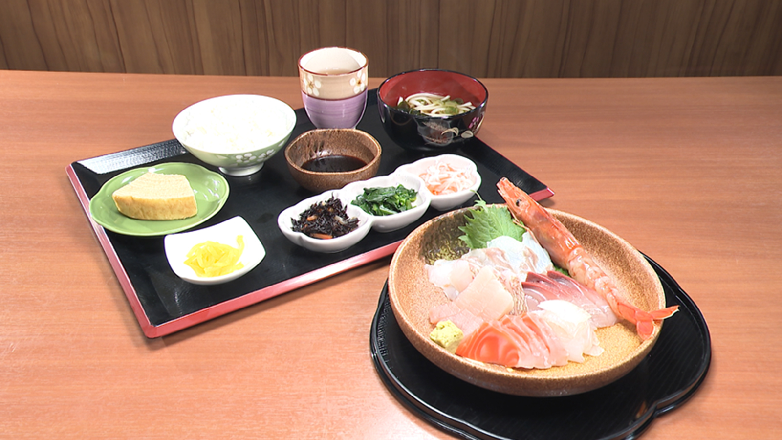 ボリュームだけでなく、産地にもこだわるのは料理長。『刺身定食』(1,200円 ※夜のみ)の魚は、ほとんどが和歌山県産の天然物。「養殖物は使いたくない」と料理長。「決まったところで泳いでるやつと、大海原でグワーっと泳いでるやつは身のしまりが違う」とのこと。この日の刺身はスズキ、ツバス(ブリの幼魚)、バーナーで皮目を香ばしくあぶったマダイ。さらにガンゾウビラメにはエンガワも添え、ビンチョウマグロ、サーモン、赤エビ1尾と、合計20切れを超える豪華さ。
