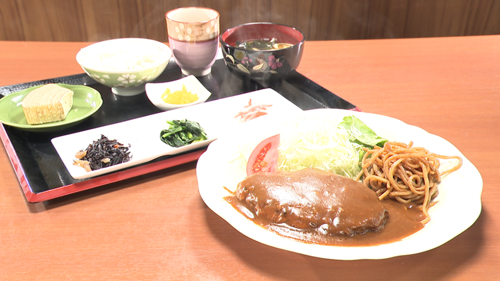 お肉230gの『ハンバーグ定食』(1,200円 ※夜のみ)も、ごはん、うどん、焼きそば付きのメニュー。ここで番組スタッフがハンバークの大きさにツッコミを入れる。「230gは結構大きいんじゃないですか?」と聞くと、「ないないない」と否定するのは店主の成川志奈さん(52)。「1人前、平均150gですよ」とスタッフが指摘すると、「おなかいっぱいになれへんかったら意味がないじゃないですか」と店主。スタッフが「なるんじゃないですか?」と食い下がっても、「ならないと思います」とキッパリ。