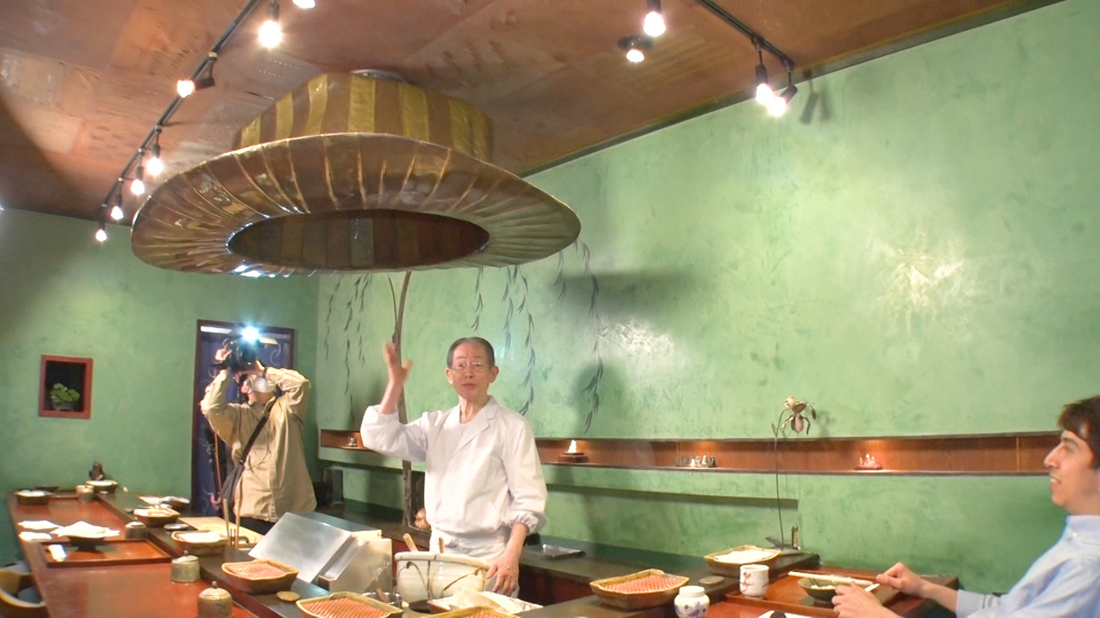 神・早乙女さんのトレードマークはハット。外出時は必ずボルサリーノを被っているという。そのため、実は店内のカウンターの天井についている換気扇がボルサリーノの形をしている。「これボルサリーノ。天ぷら揚げるときもボルサリーノ被ってるっていうのをやってる。トレードマークなんだからちょうど被ってるでしょ」と笑う早乙女さん。