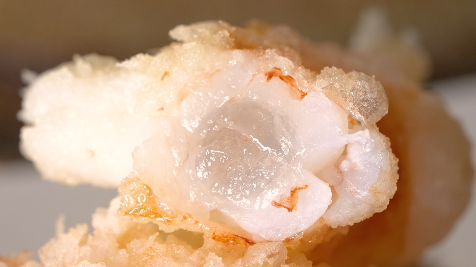 続いては車エビ。左手で頭を落とすのと同時に右手で背わたを引き抜く早乙女さん。スタッフの質問に答えながらも、流れるような神の所作には一瞬も無駄がない。そして殻を剥いたら、衣をつけて200℃の油の中へ。エビも水分が多いイメージだが、一体どれほど脱水するのか?するとわずか28秒で油から取り出す。「エビっていうのは大体芯の温度が45℃くらい。表面が200℃以上かかってるのに芯がちょっとレアで。そこが1番エビの甘さを感じるから」と早乙女さん。