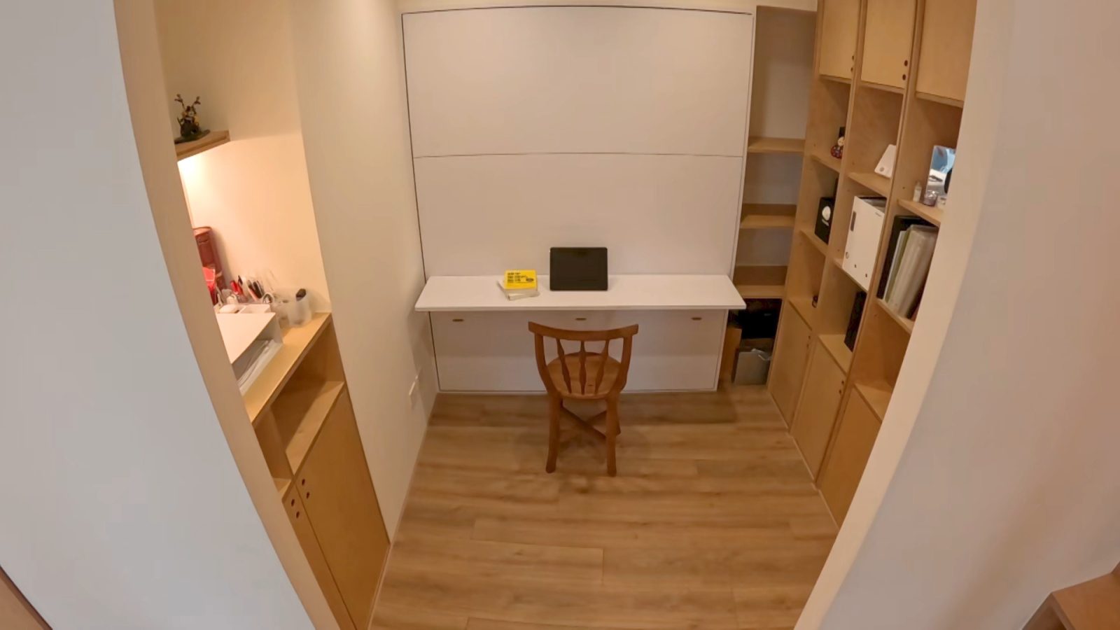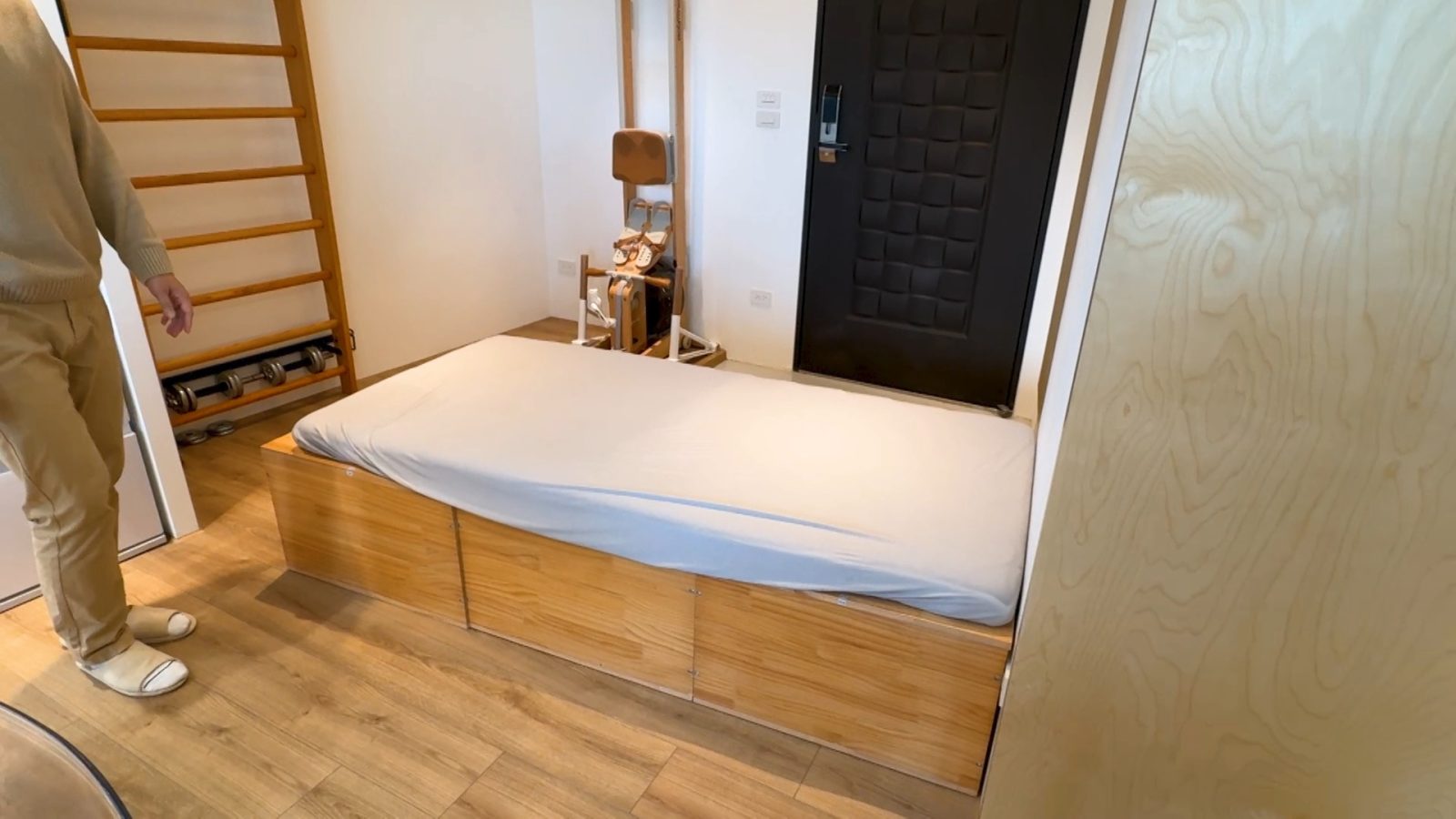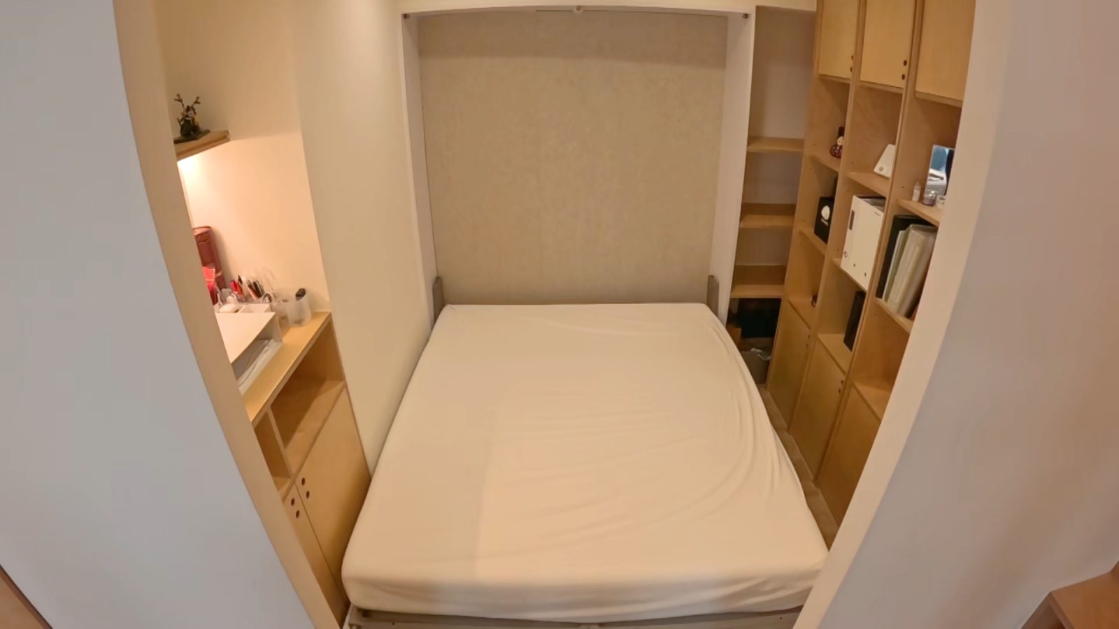 最後に、良純は約4帖の書斎を調査した。ジョンさんは「実は、ここにベッドがあります」と言って机が取り付けられた壁を倒すと、なんと壁が夫婦のダブルベッドに早変わりした。