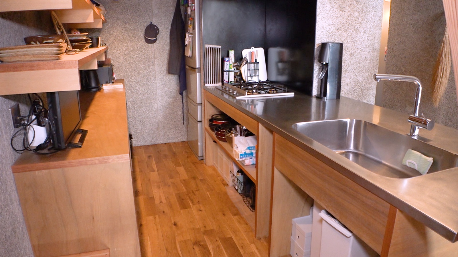 続いて、2人はキッチンへ。食器棚にはハイセンスな食器や調理器具が見える形で収納されており、充さんは「扉も引き出しもなくすことでローコスト化を図っている」と、これも節約の工夫であることを明かした。一方、スタジオの鈴木浩介は「やっぱあれってセンスないと。見せる収納って難しいですよね」とハードルが高く感じたようだった。